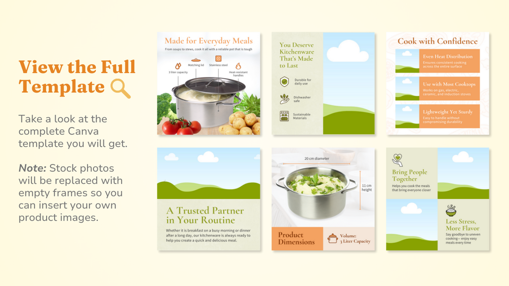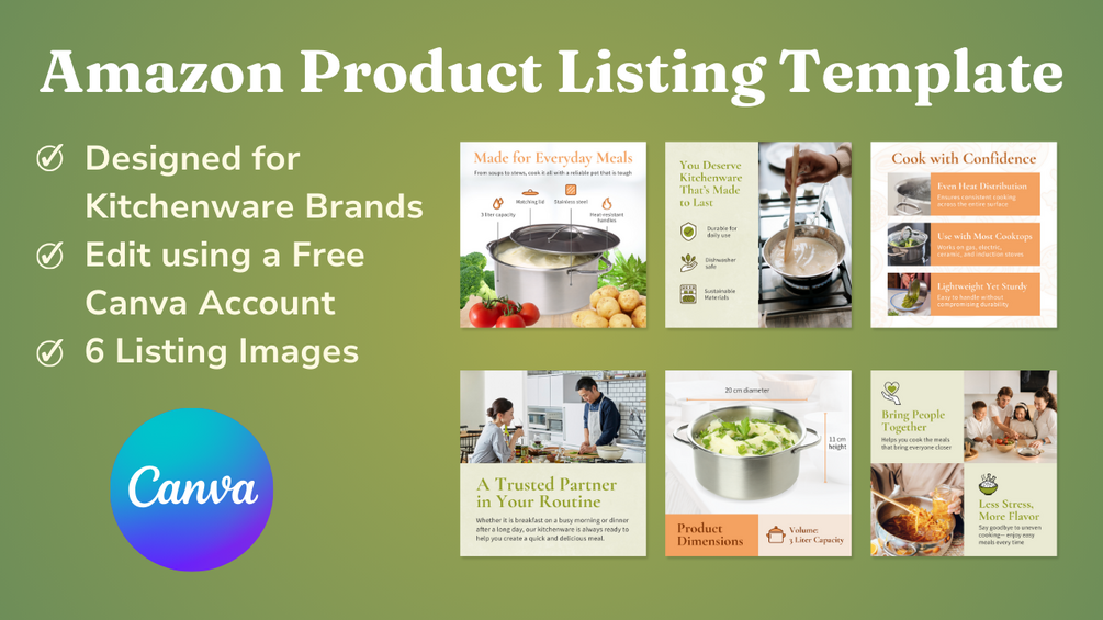 Upgrade your Amazon listing image with this professionally designed Canva template tailored for kitchenware, cookware, and dinnerware brands.
