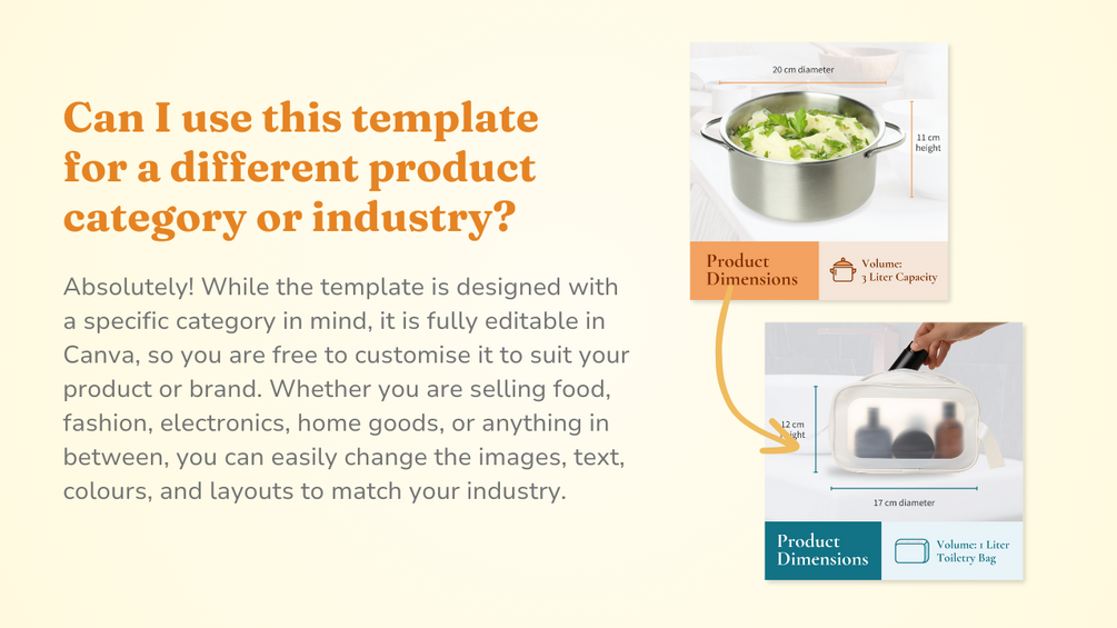 📌 Can I use this template for a different product category or industry? Absolutely! While the template is designed with a specific category in mind, it is fully editable in Canva, so you are free to customise it to suit your product or brand. Whether you are selling food, fashion, electronics, home goods, or anything in between, you can easily change the images, text, colours, and layouts to match your industry.
